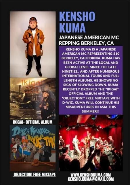Kensho Kumaはカリフォルニア州510バークレーを代表する日系アメリカ人MC。生まれは横浜、育ちは西海岸アングラのバイリンガルスタイル。1990年代後半から国内外で精力的に活動しており、数々の海外ツアーやフルアルバムのリリースを経てもなお、その勢いは衰えを知らない。KumaはRaekwonの アルバム”Only Built for Cuban Linx..”でこの文化に足を踏み入れ、お気に入りのMCはBlack Thought, Ghostface, Vinnie Paz, Sean Price, Kool G Rapなど, 実力派MCばかり